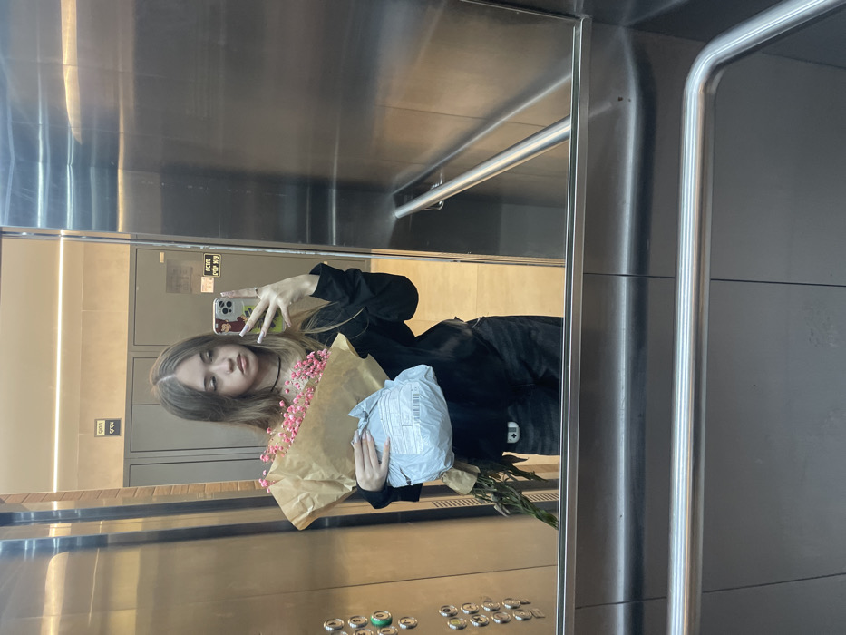 A young female is depicted inside an elevator in Raanana, Israel, utilizing a smartphone to photograph her reflection. She has long, light brown hair and is dressed in a black long-sleeved top and dark pants. In her right arm, she holds a bouquet of small pink flowers wrapped in brown paper, positioned above a light-colored plastic-wrapped package with a visible shipping label. The elevator's interior is characterized by mirrored walls, stainless steel panels, a control panel with multiple buttons on the left, and a stainless steel handrail. The reflection in the mirror reveals a building hallway with light-colored walls and doors, one displaying an 'EMERGENCY EXIT' sign in both Hebrew and English.