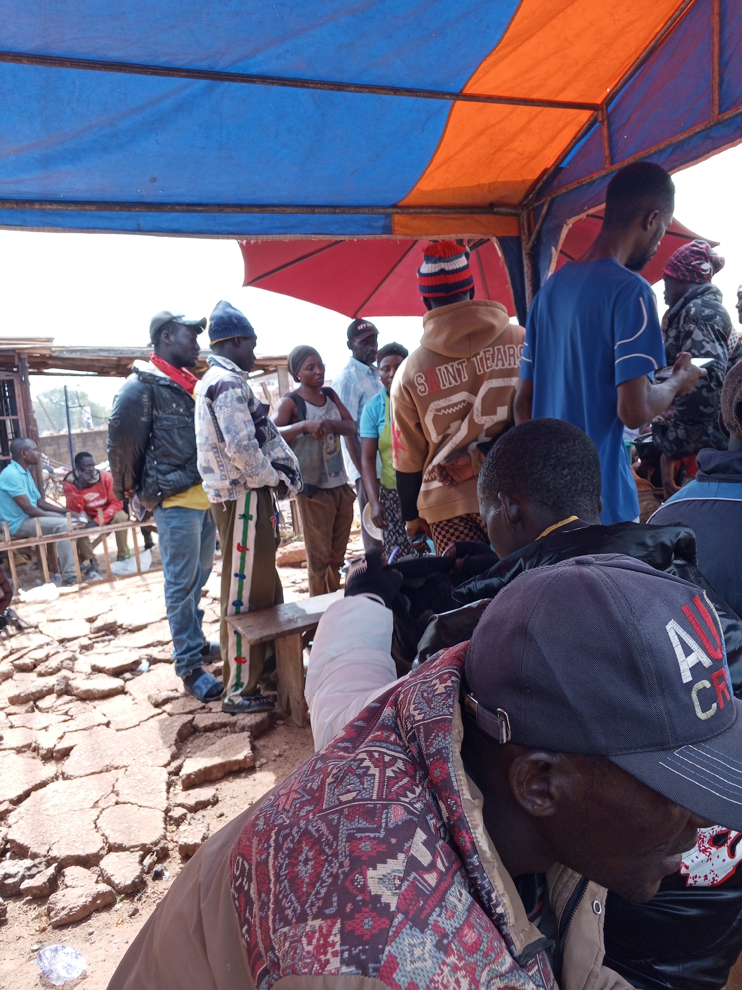 The image portrays an outdoor gathering in Yelwa, Nigeria, beneath a temporary shelter constructed from an overhead canopy of alternating blue and orange fabric panels supported by a metal framework. The ground surface is an uneven, dry expanse of cracked earth littered with small stones and debris. Approximately fifteen individuals are visible within the scene, predominantly adult males, varying in age. In the foreground, a man is seated with his back to the viewer, wearing a dark blue baseball cap with white and red embroidered lettering and a multi-patterned jacket over a tan layer. His head is slightly bowed. Towards the left mid-ground, a man stands in a black leather-like jacket, a yellow shirt, blue jeans, and a red neckerchief, facing right. Beside him, another man wears a patterned long-sleeved shirt, green track pants with vertical red and green stripes, and a dark beanie. A woman in a dark tank top and brown pants stands behind them. In the left background, two men are seated on a wooden structure, one in a light blue shirt, the other in a red long-sleeved shirt. In the right mid-ground, several individuals are standing. One wears a tan hoodie with "S INT TEARS 22" printed on the back and a red, white, and blue striped beanie. Another wears a blue t-shirt with white accents. A third individual in a camouflage-patterned jacket is observed holding a mobile phone. A segment of a red umbrella is visible in the upper right background, adjacent to the canopy. Other visible objects include rudimentary wooden benches, several mobile phones, and a discarded clear plastic bottle on the ground. The environment suggests an open-air setting under bright daylight, with glimpses of distant structures and a clear sky beyond the canopy. Individuals appear to be standing, sitting, and engaging in informal social interaction or observation within this semi-sheltered area.