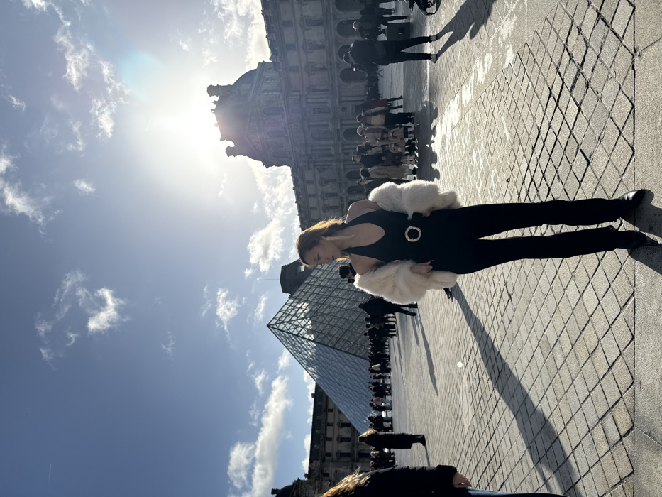 The image depicts an outdoor scene in the courtyard of the Louvre Museum in Paris, France