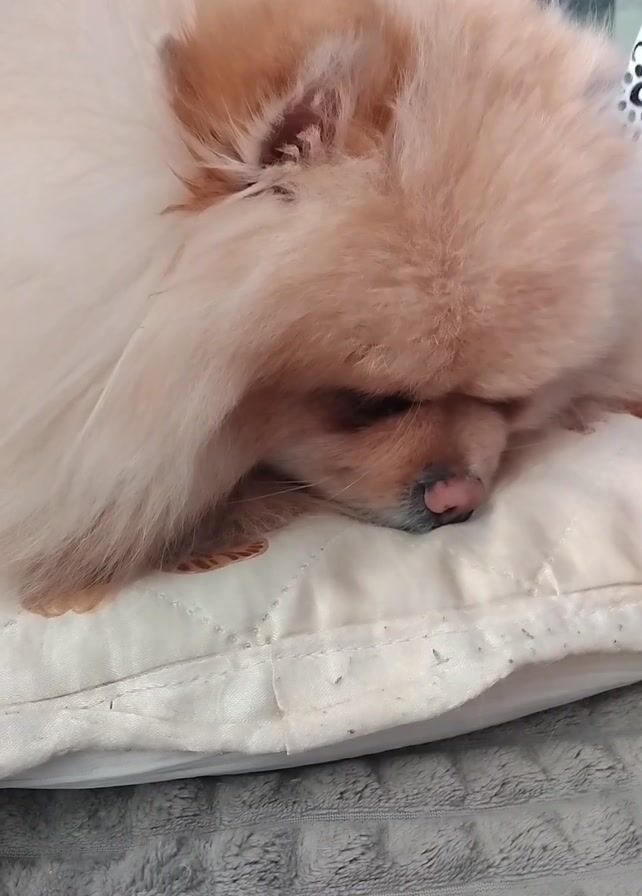 fluffy, light-brown Pomeranian dog lying down on a white cushion with quilted patterns. The dog's head is resting on the cushion, and its eyes are partially closed. The dog is lying on a gray, textured blanket. The dog makes two distinct sounds that resemble a snore. A bit of a patterned object is slightly visible in the background.