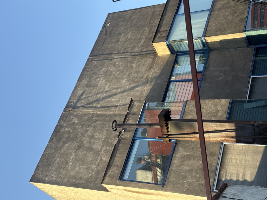 The image depicts an upward view of a multi-story building exterior in Mexico City, Mexico, under a clear blue sky. The building features a rough-textured, dark grey facade with a prominent corner on the left. Multiple rectangular windows with blue frames are visible, some reflecting an unseen red-orange structure and a circular object, possibly a satellite dish. A tall, slender, rusty metallic vent pipe, topped with a circular, finned cap, extends vertically in the mid-ground. A horizontal, dark reddish-brown metal beam crosses in front of the vent pipe in the lower portion of the frame. Strong sunlight illuminates the scene from the left, casting a distinct, elongated shadow across the upper section of the building's main facade. No individuals are present.