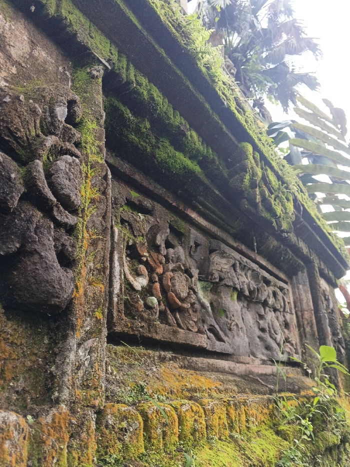 An old stone wall, heavily textured with carvings, stands weathered and covered in moss and lichen