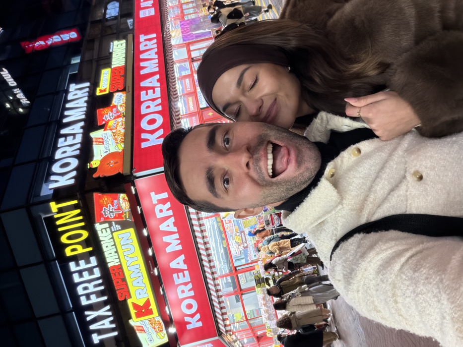 A selfie photograph captures a Caucasian male and female at night, positioned in the foreground against the illuminated facade of a commercial building in Myeongdong, Seoul, South Korea