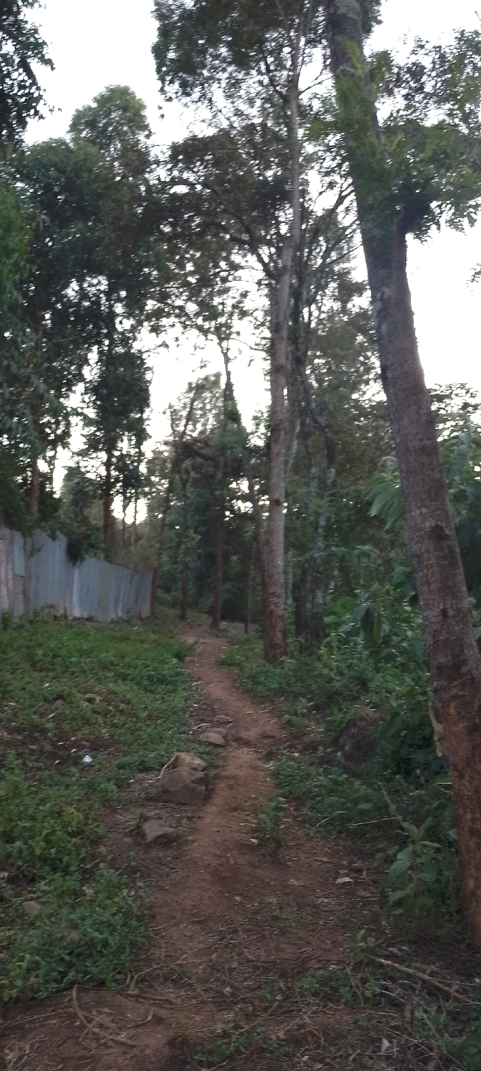 A dirt path meanders through a lush, green forest. Tall trees line the path, their canopies creating a dense overhead cover. A corrugated metal fence runs parallel to the path on the left, adding an industrial touch to the natural setting. Vegetation thrives along the path, obscuring the ground in places. The scene evokes a sense of tranquility and immersion in nature.