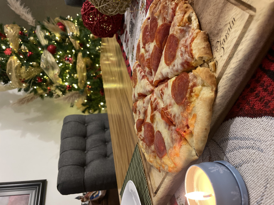 A pepperoni pizza, sliced and arranged on a wooden serving board, sits on a table with a festive red and white runner. A Christmas tree, decorated with lights and gold ribbon, is partially visible in the background. A grey tufted chair is to the left. A small blue candle with snowflake detailing is positioned near the edge of the pizza board.