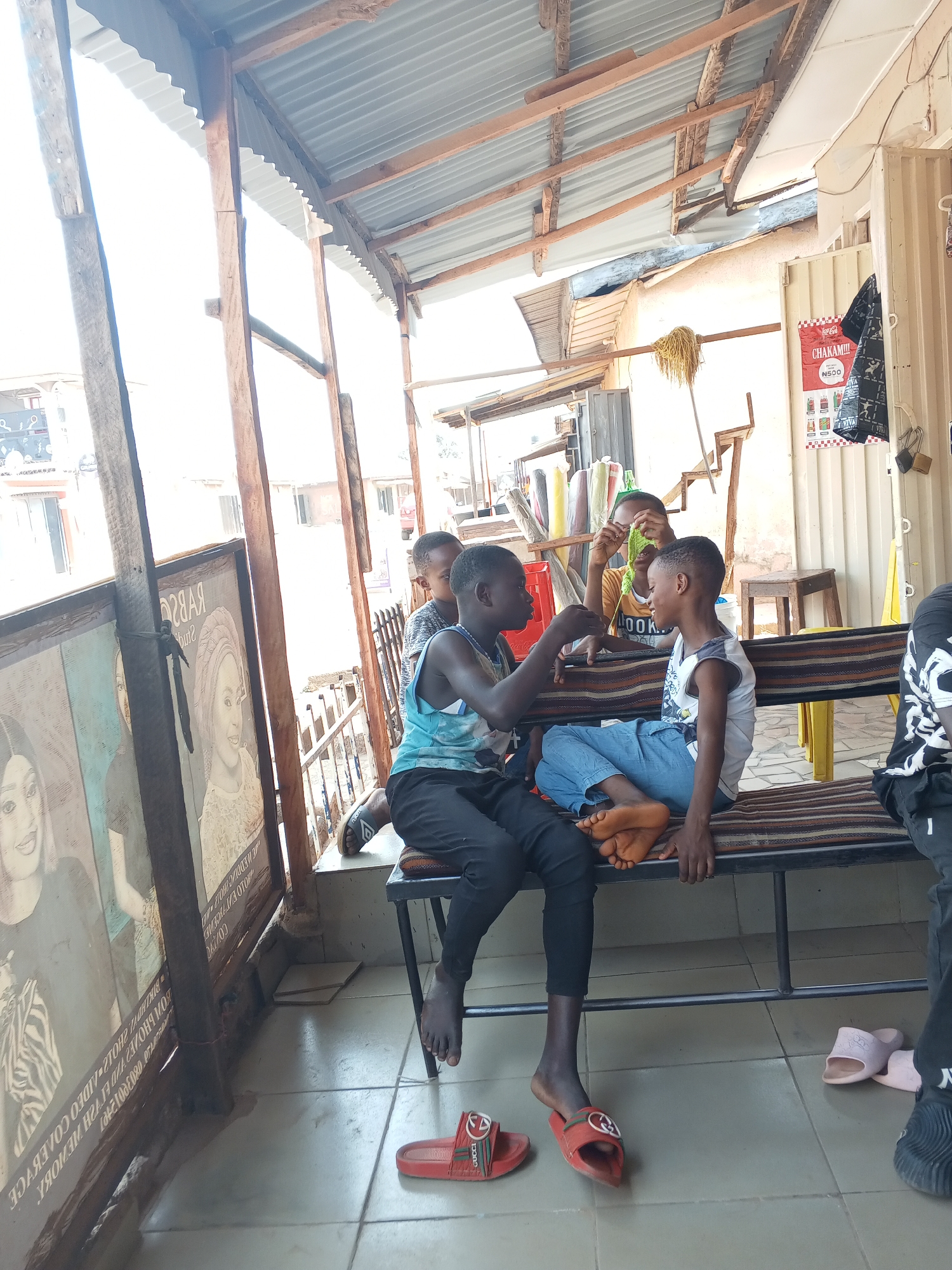 n outdoor covered area in Sabon Tasha, Nigeria, featuring a corrugated metal roof supported by rough-hewn wooden beams. The floor is covered with light-colored tiles. Four young males are present in the foreground and mid-ground. Three boys are seated on a metal-framed bench with a striped fabric seat (brown, beige, and black). The boy on the far left, wearing a blue and white patterned sleeveless top and dark pants, is barefoot; red "Gucci" slides are positioned on the floor nearby. He is leaning towards the central boy, who is wearing a white patterned sleeveless top and blue jeans, sitting barefoot with his feet positioned on the bench. The central boy is looking towards the left and smiling. Behind them, a third boy wearing a yellow t-shirt is holding up a small, green, crocheted or knitted object, appearing to examine it. A fourth boy is partially visible behind the bench to the right. A fifth person's lower leg and foot, wearing a dark sandal, are visible on the far right. Pink slides are also present on the tiled floor near this fifth person. To the left, large vertical posters displaying images of women and reversed text, including "RABAS STUDIO" and "VIDEO COVERAGE," lean against wooden supports. In the background to the right, a cream-colored corrugated metal wall features a "Coca-Cola CHAKAM!!!" advertisement with "N500" visible, a dark patterned garment hanging, a wooden stool, and a mop leaning against the wall. Rolls of fabric are visible on shelving units further back behind the seated individuals. The scene is illuminated by natural daylight.