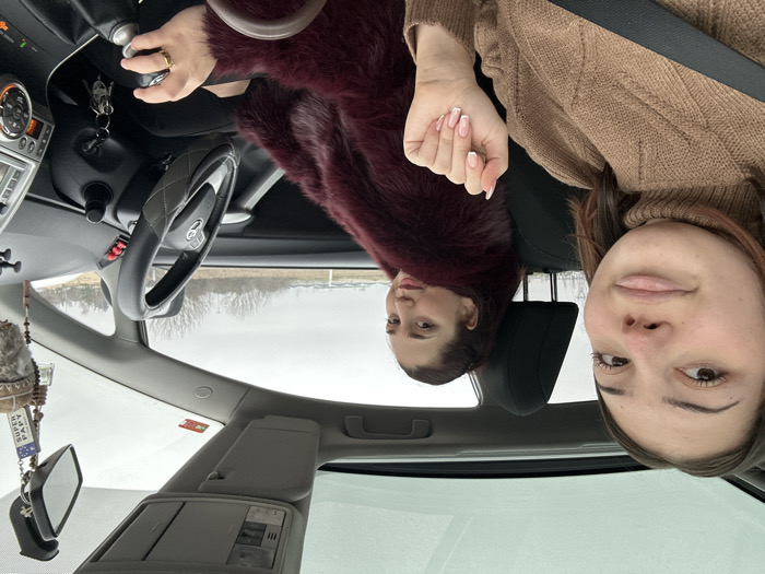 The scene depicts two adult females inside the front cabin of a Toyota passenger vehicle in Lampertheim, France. An overcast sky is visible through the vehicle's panoramic sunroof. The female in the front passenger seat, with brown hair and light complexion, wears a brown cable-knit turtleneck sweater and a seatbelt. Her left hand, featuring French-tip manicured nails, is visible. She faces the camera with a neutral expression. The female in the driver's seat, with dark hair tied back and light complexion, wears a dark red faux fur coat. Her right hand, adorned with a ring on the ring finger, rests on the manual gear shifter. She looks towards the camera, angled slightly over her right shoulder, exhibiting a faint smile. The vehicle's interior includes a grey-covered steering wheel with a Toyota emblem, a visible dashboard with controls, and keys in the ignition. From the rearview mirror hang a beaded ornament, an evil eye charm, and a rectangular tag displaying "SUPER PAPY." The external environment, visible through the windows, reveals a flat, open landscape with sparse trees and distant structures along a roadside, under a uniformly grey sky.