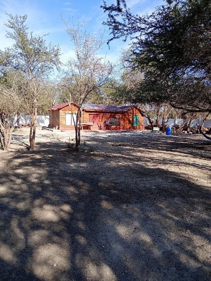 This image captures a single-story, red-brown wooden structure with a red tiled roof, located in a dry, semi-arid environment in Pozo Almonte, Chile