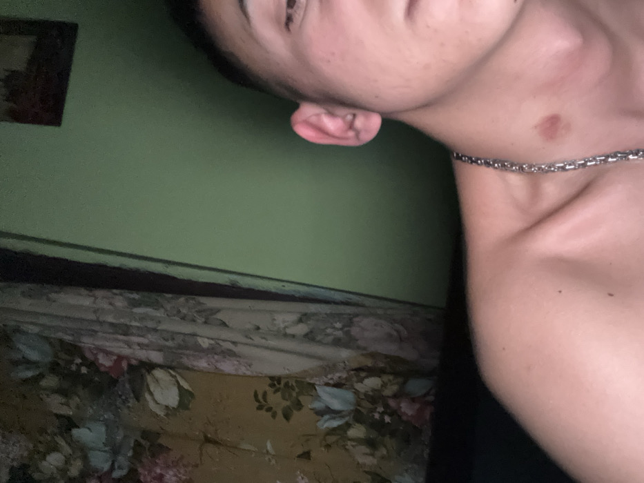 A close-up image depicts the upper right torso and right side of the face of a male individual in an indoor setting