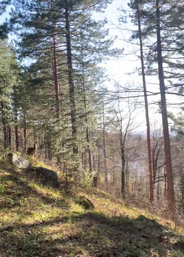 sunny forest with tall trees and a sloped ground covered in grass and leaves. The camera pans upwards to reveal the sky and sunlight filtering through the trees. In the distance, a view of hills or mountains can be seen. At the end, a person is briefly visible sitting on a rock amidst the trees.
