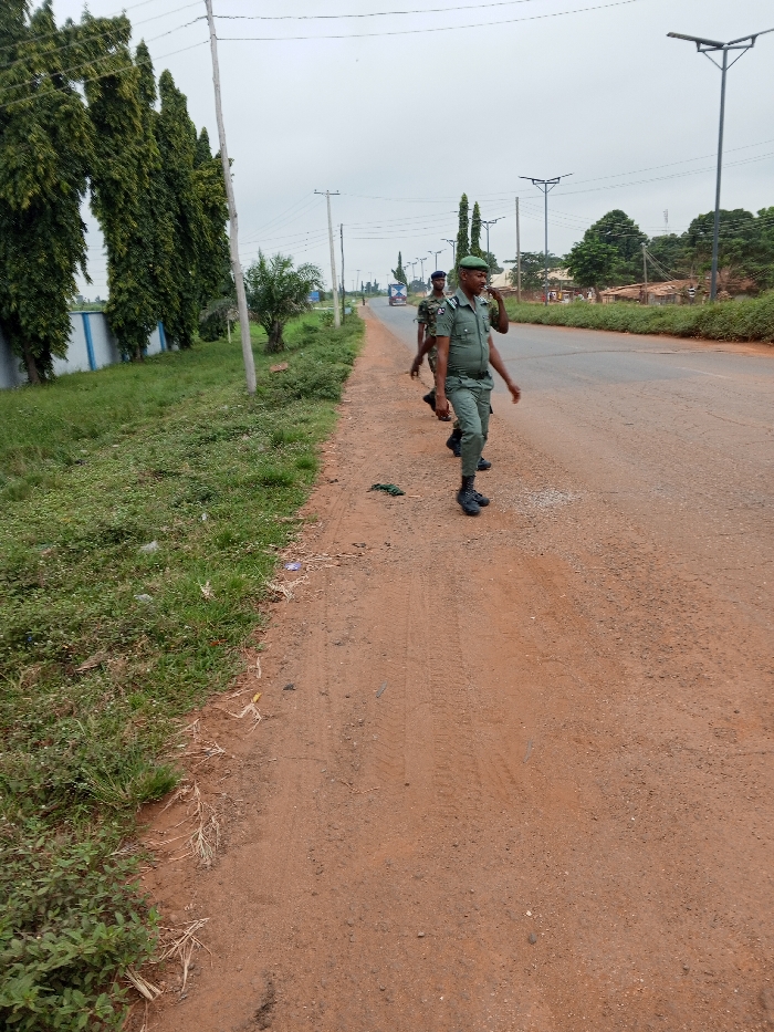The image depicts a daytime scene on a road in Markurdi, Nigeria, under an overcast sky. Two adult males, wearing green camouflage-patterned uniforms, black boots, and dark green berets, are walking along a reddish-brown dirt shoulder adjacent to a paved road. The lead individual has his right hand raised to his ear, suggesting he is holding a communication device. The second individual follows slightly behind. To the left of the dirt shoulder is a strip of green grass and weeds, bordered by a blue and white striped fence or wall, behind which stands a line of tall, narrow, dark green trees. Several utility poles with overhead wires and modern streetlights featuring solar panels are visible along the roadside. A paved road occupies the right side of the frame, extending into the distance where a vehicle with blue and white markings is partially discernible. Scattered pieces of litter are present on the dirt shoulder.