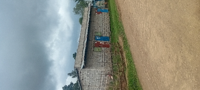 The scene depicts a single-story building in Unknown, Kenya, constructed from unpainted grey concrete blocks with visible mortar lines
