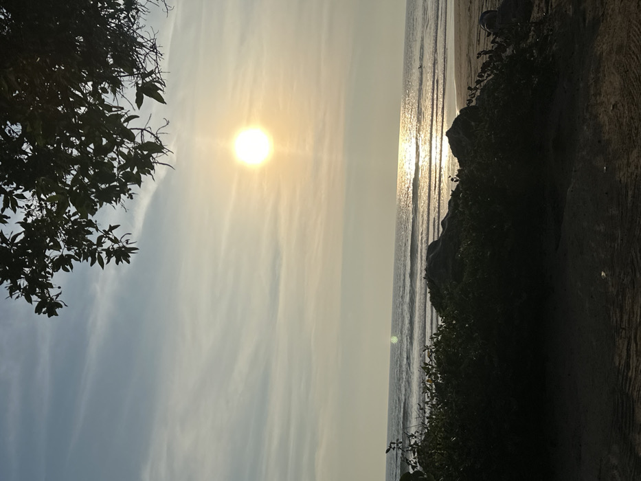 A tranquil beach scene features a radiant sun positioned high in the sky, casting a warm glow over the scene. The water's surface reflects the sunlight in a shimmering trail. Vegetation borders the beach, adding a touch of nature's edge. A tree branch with leaves frames the image's left side. The composition evokes a sense of calm and natural beauty.