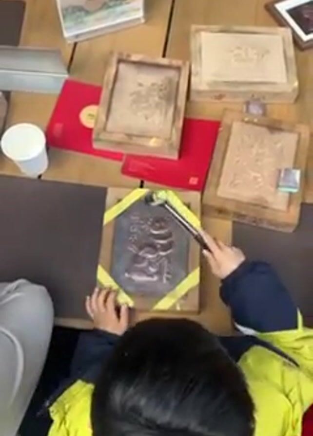 From an overhead angle, a child is seen working on a craft project at a table. The child, wearing a blue jacket with bright yellow accents, is using a small mallet to tap a tool against a dark-colored, framed plaque. The plaque seems to have an image embossed on it. Several other framed plaques are also on the table, along with small red envelopes and a paper cup. A sign with Chinese characters stands upright on the table. The child's activity suggests they are participating in a craft activity, possibly related to Chinese culture. The child's back is to the camera. Their hands are holding the mallet and tool. The workspace is well-lit.