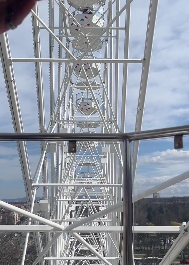 view from inside a Ferris wheel, looking out over a city. The frame of the Ferris wheel is predominantly white and composed of numerous metal bars. A person is holding a black object in the top left corner of the frame. Beyond the Ferris wheel structure, there's a panoramic view of the city with buildings, trees, a park, and mountains in the distance. The sky is blue with scattered white clouds. The video is shot from a slightly elevated position, looking out and upward. The camera pans slightly to the right, showing more of the city and the landscape.