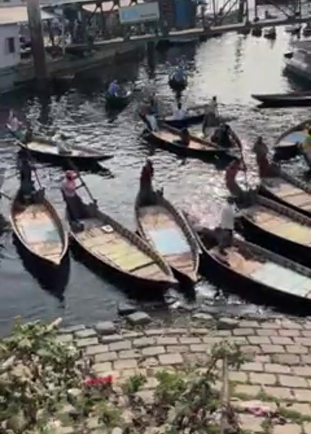 From an elevated perspective, the video displays a harbor scene filled with small boats. These vessels, primarily wooden, are closely packed together, some carrying individuals who are actively rowing. The water reflects sunlight, creating a sparkling effect. Along the edge of the harbor, a stone embankment is visible, partially covered with vegetation. In the background, a pier structure and a larger vessel are discernible, suggesting a bustling waterfront environment.