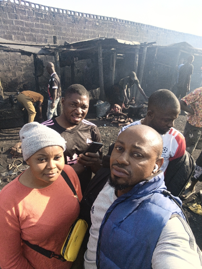 The image captures a wide-angle selfie taken in Fagge D2, Nigeria, against a backdrop of an outdoor, industrial-like area characterized by dark, rudimentary structures and ongoing activities
