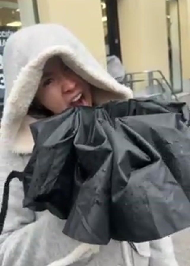 A person in a gray hooded jacket struggles with a black umbrella turned inside out by the wind. They are outdoors in what appears to be an urban setting, with buildings visible in the background. The person is expressing surprise or frustration. The scene is wet, suggesting rain or recent rain.
