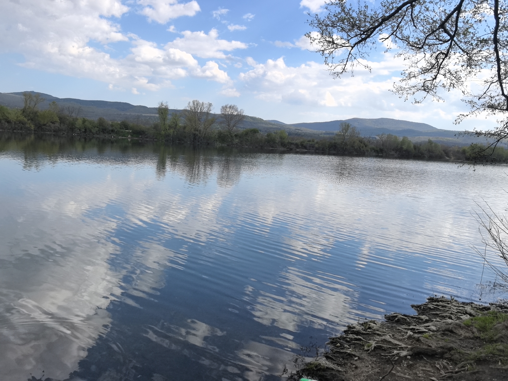 The image captures a tranquil scene of a lake reflecting a sky dotted with white clouds. The location is Dabovo, Bulgaria, suggested by the presence of mountains visible in the background. The lake's surface has gentle ripples, mirroring the sky above. The shoreline is visible on the right side, featuring exposed roots and sparse vegetation. The horizon is lined with trees and mountains. A branch is visible on the right side of the image, partially obstructing the view.