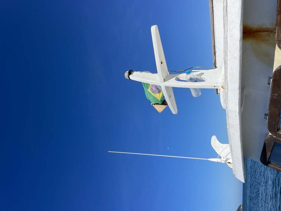 A white boat with the Brazilian flag is shown against a clear blue sky and a sliver of ocean. The flag is attached to a white support structure, and two water bottles are visible. The boat's exterior is aged, with some rust. A thin antenna extends into the sky.