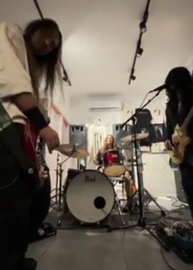 A three-person band plays in a small, white-walled shop. The camera faces the band head-on, focusing on the drummer, with the guitarist on the right and bassist on the left. All three appear to be wearing long hair and performing with energy. Behind the band, clothes hang on a rack, and two speakers are positioned. A man in black drinks a beverage, sitting on a cinder block seat. A group of people stands on a sidewalk at night, watching something of interest. String lights are strung overhead. Buildings line the street.