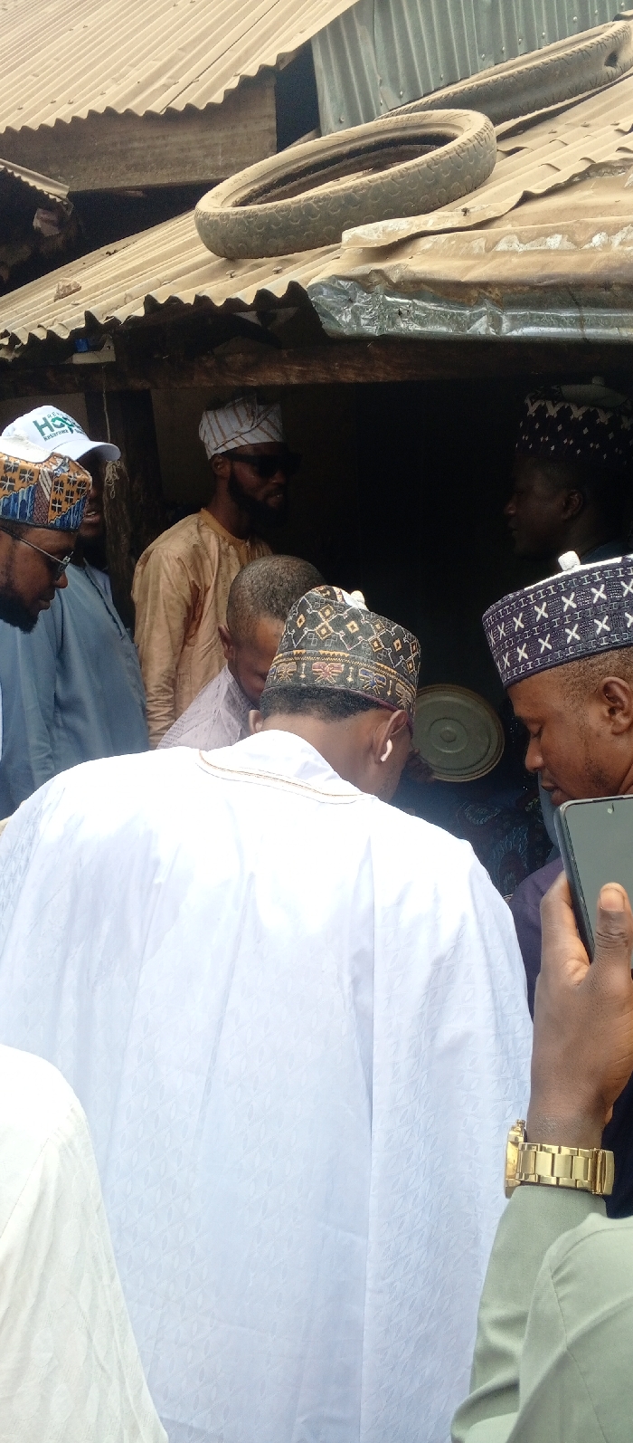 The image depicts a gathering of approximately seven to eight adult males in the city of Toto, Nigeria. The scene appears to be outdoors or under a rudimentary shelter, with a weathered, corrugated metal roof visible in the upper background. Two worn tires rest on the corrugated roof. The men are primarily dressed in traditional attire, including various patterned caps such as black with gold/white designs, blue with white 'X' patterns, and striped white/grey. Garments include white agbadas or kaftans, light blue casual wear, and a beige/tan traditional garment. One man in the front-left wears a white baseball cap with green text reading "HSP." Another man in the center background wears dark sunglasses and a striped cap. In the foreground, a man on the right holds a dark smartphone vertically in his right hand and wears a gold-colored wristwatch on his left wrist. The men appear to be observing something out of frame or engaged in conversation, with some looking downwards and others forward. A light-colored, circular object is partially visible in the dark background behind some individuals.