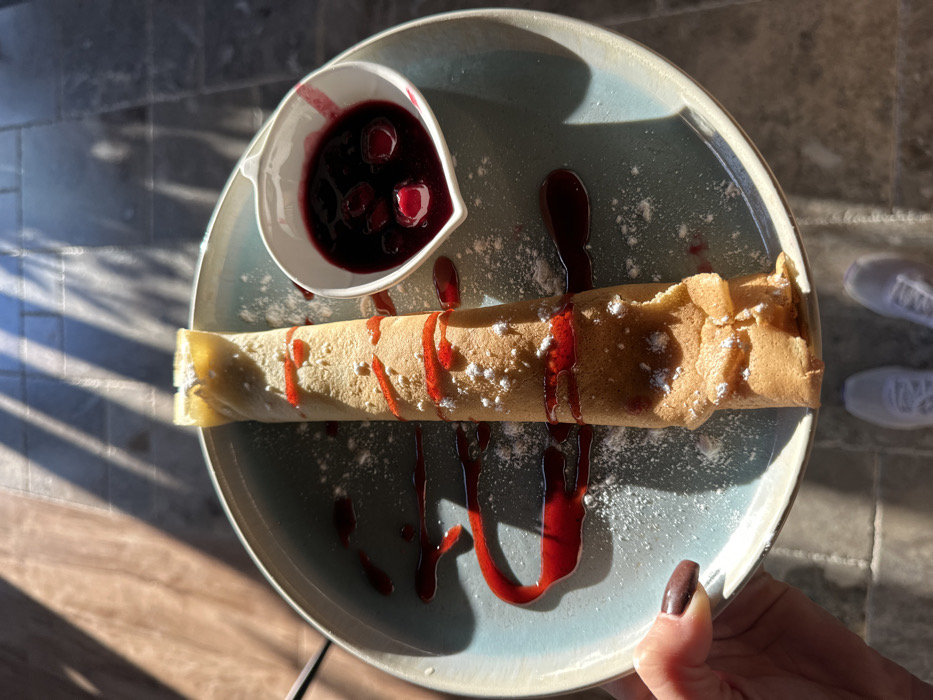 - "A light blue-green ceramic plate, gripped by a human hand with dark brown manicured nails in the lower-left, displays a single rolled crepe" by FM-1xQae2, licensed under CC BY 4.0