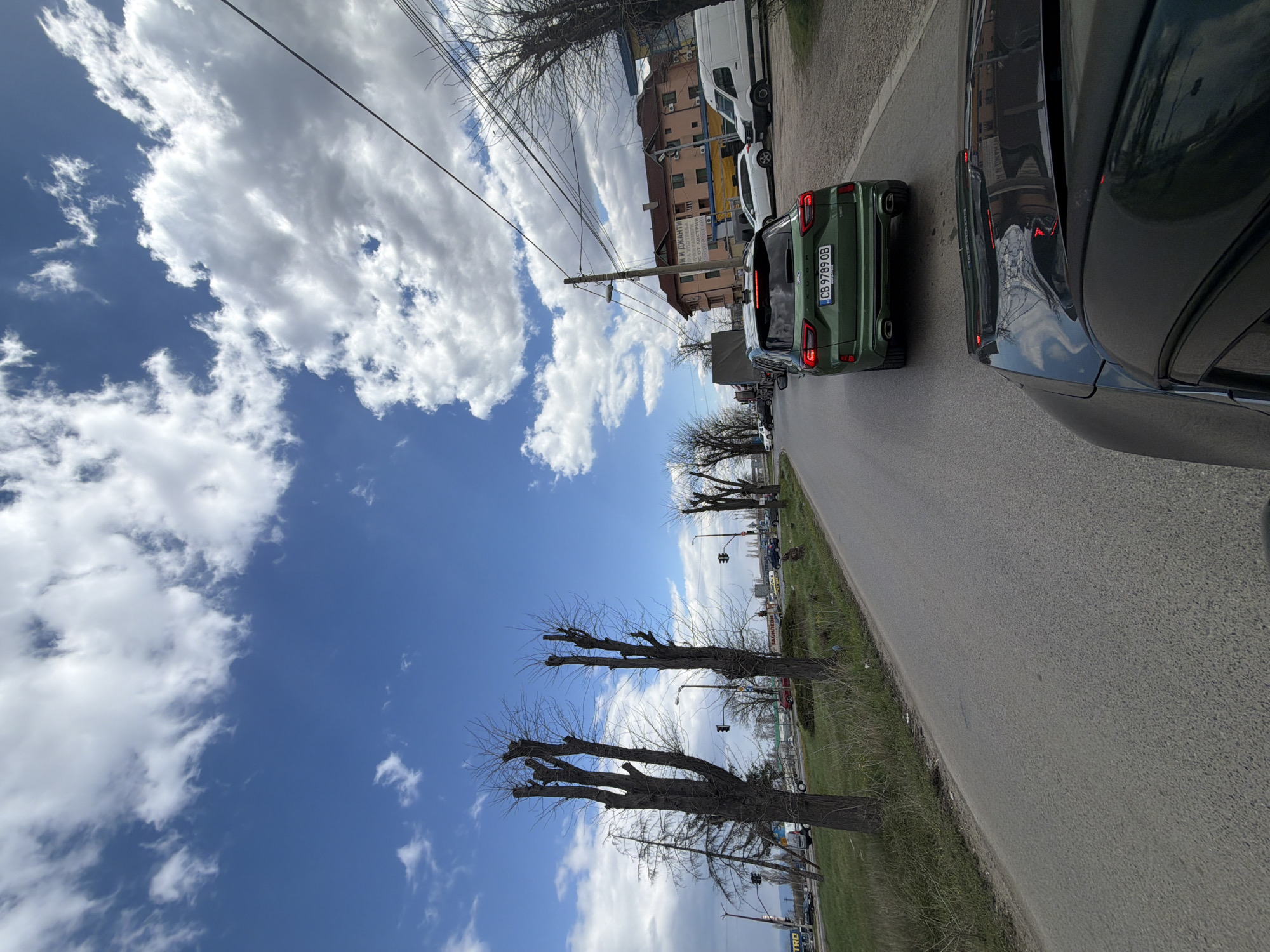 The image depicts a street in Voluyak, Bulgaria. The sky is partly cloudy. The road is asphalt and has vehicles on it, including a green SUV with license plate "CB 9789 OB". There are buildings on the right side of the road and utility poles with wires. Along the road, there are trees with bare branches. The image seems to be taken from inside a vehicle, as part of a car's body is visible in the lower right corner. There is traffic in the road, with cars and vans present.