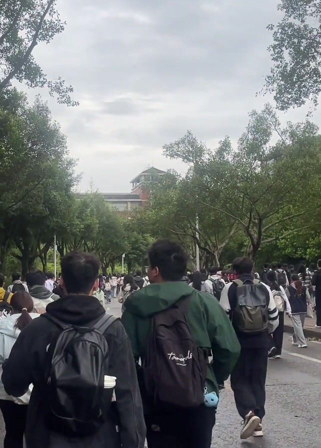large group of people walking down a tree-lined street towards a brick building in the distance. The sky is overcast. Most people appear to be wearing backpacks. The video is taken from behind the group, so faces are not clearly visible. Some people are carrying umbrellas or other items. The street appears to be paved and wet. The trees are mostly green and leafy.