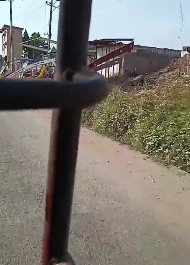view from a moving vehicle, focusing on a metal frame that obstructs the view. Outside, the road is paved and cracked. A pile of what appears to be playground equipment, including a slide, is visible on a dirt patch next to the road. There is a white car parked near the playground equipment. Buildings are visible in the background, along with power lines running overhead. The sky is clear and bright.