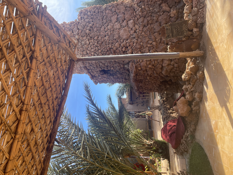 A low-angle shot reveals a sunny outdoor scene. A woven wooden structure partially frames the view, contrasting with a rock wall made of rounded stones. Palm fronds sway in the center, with a glimpse of a building in the background. A red cloth drapes over stones near a tiled surface and small patch of grass. The clear blue sky is visible through the gaps.