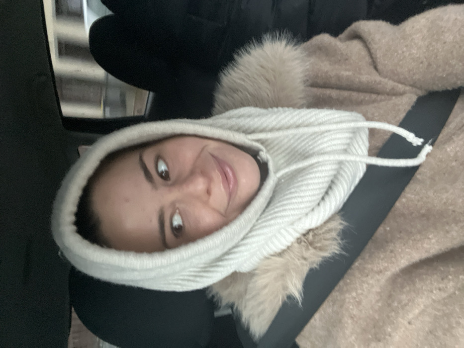 A female subject is depicted seated within a vehicle in Roubaix, France. She wears a light beige ribbed knit balaclava with prominent drawstrings, covering her head and neck. Over her torso, she is clothed in a beige-tan coat or jacket with a distinctive lighter-toned faux fur collar. A black seatbelt is securely fastened, extending diagonally across her chest and right shoulder. Her face, featuring brown eyes and a subtle smile, is angled towards the viewer's left, with her gaze directed towards the upper left, beyond the immediate frame. The vehicle's interior is visible behind her, including dark upholstery of what appears to be a headrest. Through the window in the upper right background, blurred architectural elements, consistent with light-colored urban buildings, are discernible, indicating an outdoor city setting. The scene is illuminated by ambient, diffuse light.
