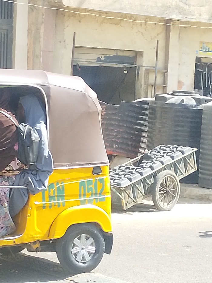 An outdoor street scene in Darmanawa, Nigeria, depicts a yellow three-wheeled auto-rickshaw in the left foreground and a two-wheeled utility cart to its right