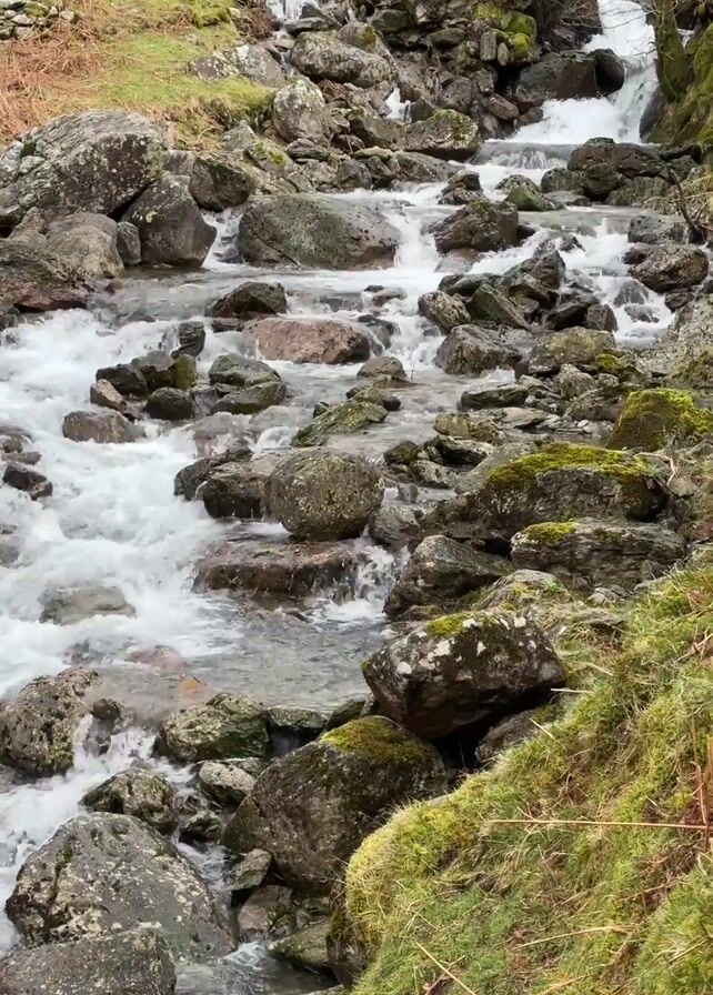 stream flowing downhill over rocks. The water is white and frothy as it rushes over the stones, many of which are covered in moss. The banks of the stream are covered in green grass and some brown vegetation. There are also trees along the side of the stream.