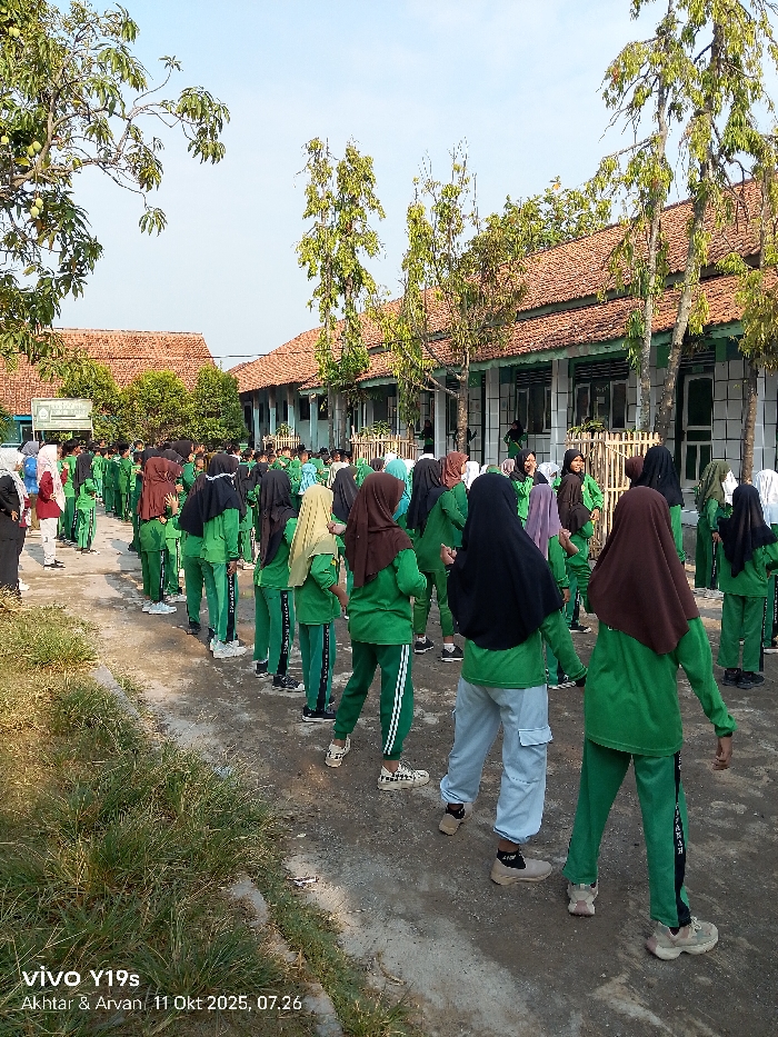 This image depicts an outdoor scene in Jagapura Kidul, Indonesia, at 07:26 AM on October 11, 2025. A group of approximately 30-40 individuals, predominantly female and appearing to be students, are arrayed in loose lines or groups on an unpaved dirt and gravel ground. Most individuals are wearing a uniform consisting of a long-sleeved green shirt and green track pants with white side stripes. Many are wearing hijabs of various colors including brown, black, light blue, yellow, and white. Their postures suggest participation in an organized group activity, possibly light exercise or an assembly, with some arms slightly bent or raised. In the background, a row of single-story buildings with light-colored, possibly white or light green, facades and distinctive terracotta-tiled roofs is visible. These structures appear to be school buildings. Several tall, slender trees with sparse green foliage are positioned between the buildings and the group of people. To the far left, a larger tree with denser green foliage and unripe fruit is present. The sky is clear blue, and the scene is brightly illuminated by natural sunlight, casting short shadows consistent with the early morning timestamp. Patches of green grass are visible along the left edge of the foreground.