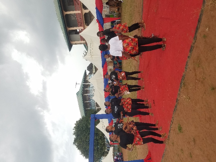 The image displays an outdoor scene in the city of Alor, Nigeria, under an overcast sky. Ten individuals, predominantly female, are positioned on a rectangular red carpet laid over sandy earth. They wear a uniform consisting of black t-shirts, black leggings, and short, patterned red and orange wrappers or skirts. One individual in the foreground wears a white t-shirt with black leggings and a patterned wrapper. The individuals appear to be performing or posing, with some barefoot and others wearing sandals or anklets. In the mid-ground, multiple white canopy tents with red and blue fabric accents are visible. An archway or frame decorated in blue and red fabric stands to the left. In the background, two multi-story buildings with green-tiled roofs and visible balconies with balustrades are present. Sparse vegetation, including a large tree, is scattered throughout the scene.