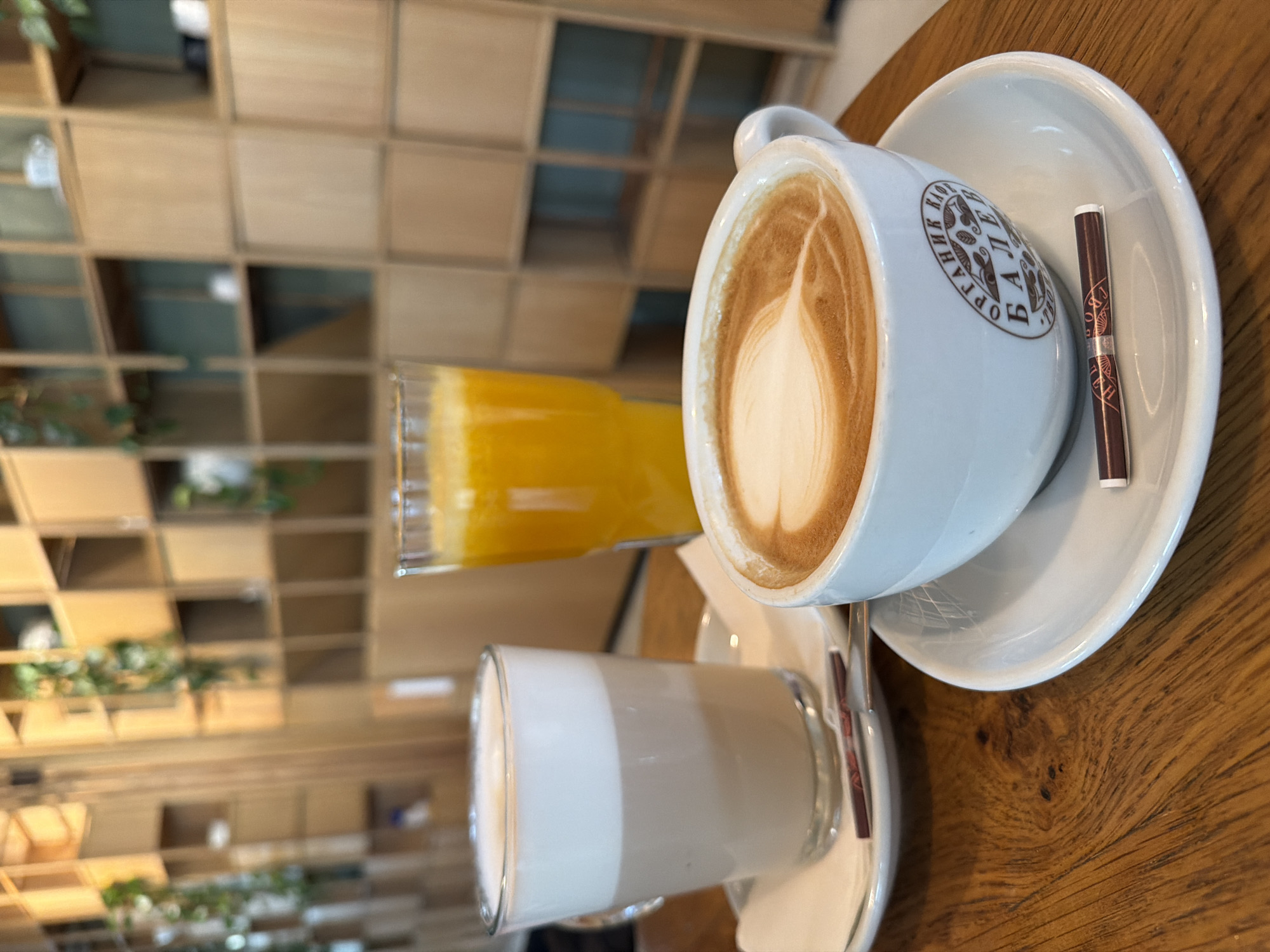 On a wooden table are a cup of latte with a heart design, a glass of orange juice, and a glass of coffee with a white layer on top. A brown sugar packet rests on the saucer of the latte. The cup has the words "Орфей Балет" on it. The location is likely in Sofia, Bulgaria, given the Cyrillic script. In the background is a wall with wooden shelves and some greenery.