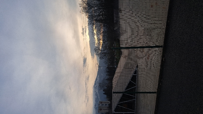 The image depicts an outdoor scene in the city of Unknown, Unknown, captured at either dawn or dusk under an overcast sky. In the immediate foreground, a dark, asphalt-like surface is visible. A green metal fence, approximately waist-height, extends horizontally across the middle of the frame, its panels filled with a textured, interwoven material creating an opaque barrier. Behind this fence, on the left, a large, modern architectural structure with a sloped, triangular-patterned glass or transparent roof is visible, suggesting a building entrance or skylight. Further into the midground, a line of deciduous trees, currently bare of leaves, stands against the horizon. Among these trees, a tall, multi-headed street lamp is discernible. To the far left, an apartment building with several stories and visible windows is situated below the mountain line. In the background, snow-capped mountains rise, extending across the entire width of the frame. The sky is predominantly gray and cloudy, with a band of soft, yellowish-orange light visible on the horizon to the right, indicating the position of the setting or rising sun, partially obscured by clouds and trees. No individuals or discernible actions are present.