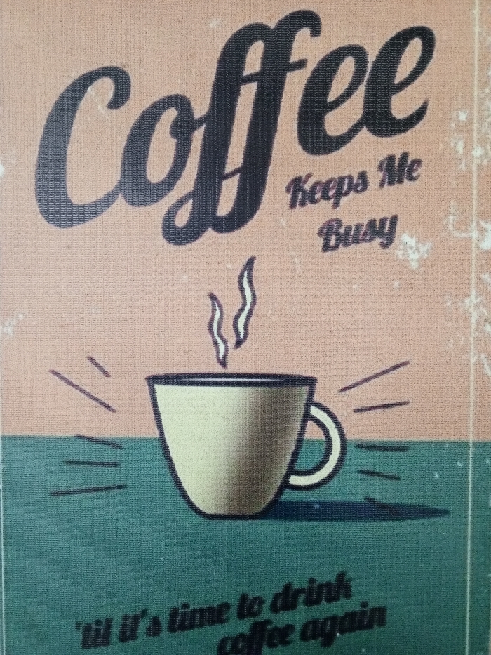 This is an image of a graphic poster or sign, captured in Voa Yeav, Cambodia. The graphic depicts a stylized illustration of a steaming coffee cup with associated text, rendered in a vintage aesthetic. The background is horizontally divided: the upper portion is a faded peach color, and the lower portion is a dark teal. A light beige coffee cup, outlined in dark grey or black, is centrally positioned on the dividing line. Two white, wavy lines ascend from the cup, symbolizing steam, and short, dark radiating lines extend from its sides. The word "coffee" is prominently displayed in large, black script font across the upper section. Below this, in smaller black script, are the words "Keeps Me Busy." At the bottom, partially visible, the text reads "'til it's time to drink coffee again" in a similar black script. The entire graphic displays a fine, textured surface, resembling woven fabric or canvas, with scattered white speckles creating a distressed finish. No individuals are depicted, and no active interactions are occurring; the scene is a static illustration.