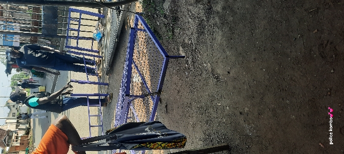 An outdoor scene in a semi-urban area of Nairobi, Kenya, is depicted under bright daylight. The foreground consists of an unpaved, dusty ground with sparse vegetation. A person, partially visible on the far left, wears an orange shirt and holds a dark bag with a yellow and black patterned base. In the mid-ground, two dark-skinned males are positioned around several purple metal structures. The man on the left wears a black cap, a black vest with a teal shoulder accent, blue trousers, and sandals. He leans forward, pointing downwards with his right hand at a purple metal bed frame. His left hand is also near the frame. The man on the right, wearing a dark blue polo shirt, blue trousers, and sandals, stands upright, observing the interaction. Two purple metal bed frames, appearing to be single beds, are visible on the ground. One is partially upright, while the other lies flat. A blue plastic item lies near the frames. In the background, a paved road stretches with several pedestrians, including one carrying a yellow jerrycan. Residential buildings with tiled roofs line the street. A metal gate structure is visible on the far right. The overall environment suggests a roadside area, possibly a commercial or transitional zone within the city. The text "police kombo" with two pink heart emojis is overlaid on the lower left portion of the image.