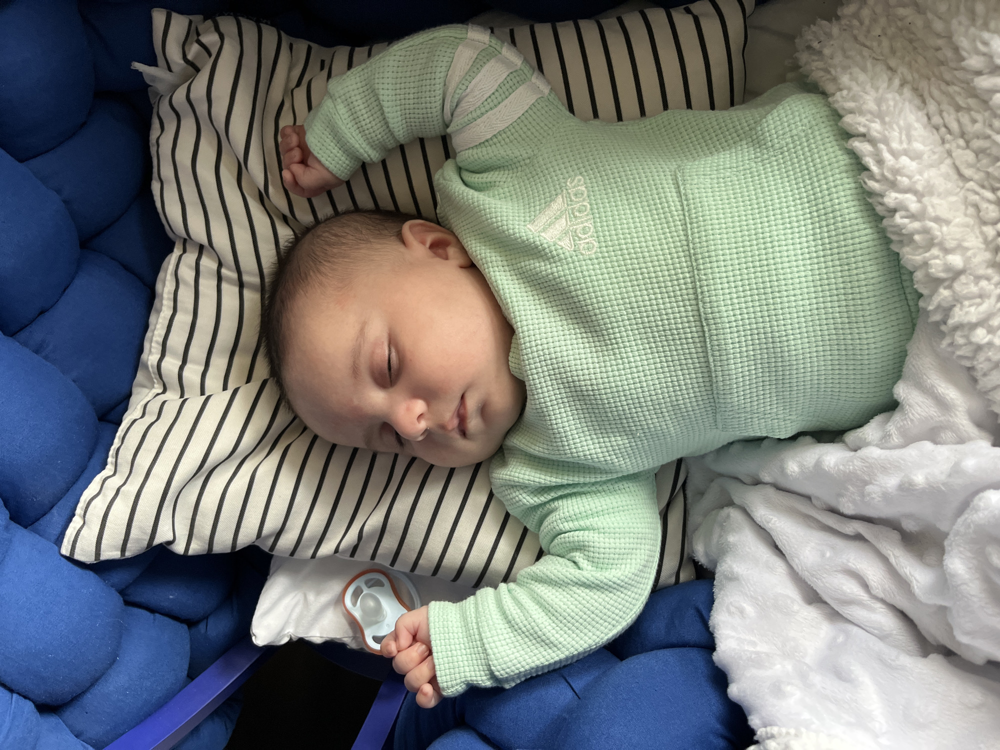 The image presents an overhead view of an infant sleeping on its back, situated within a containment structure in Offenbach am Main, Germany. The infant wears a light green, waffle-knit long-sleeved bodysuit or sleepsuit, featuring a white Adidas logo on the left chest and three white stripes on each sleeve. Its eyes are closed, and its head rests on a pillow patterned with black and white horizontal stripes. Both arms are slightly raised, with hands loosely fisted. To the immediate left of the infant's head, a white pacifier with an orange-rimmed, light blue base is visible on the striped pillow, adjacent to a smaller white cushion. The infant's lower body is partially covered by a white, textured, fleece-like blanket with raised dot patterns. A prominent blue, tufted padded surface forms part of the surrounding environment, likely indicating a bassinet, stroller, or car seat, with a dark blue strap visible in the upper left corner of the frame.