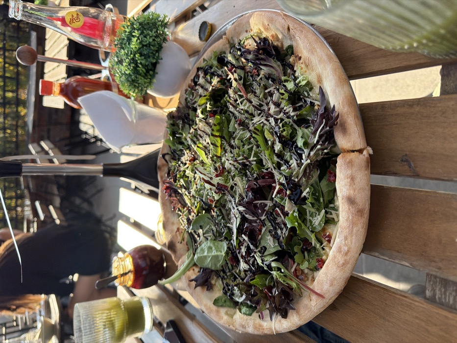 - "A pizza is topped with an assortment of greens, including arugula and shredded cheese, drizzled with a dark sauce, and scattered with red bits" by FM-PGnDP2, licensed under CC BY 4.0