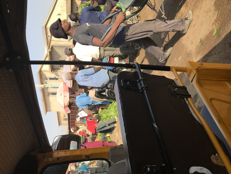 The image displays an active outdoor market scene in Rafin Par, Nigeria, viewed from the interior of a yellow and black tricycle