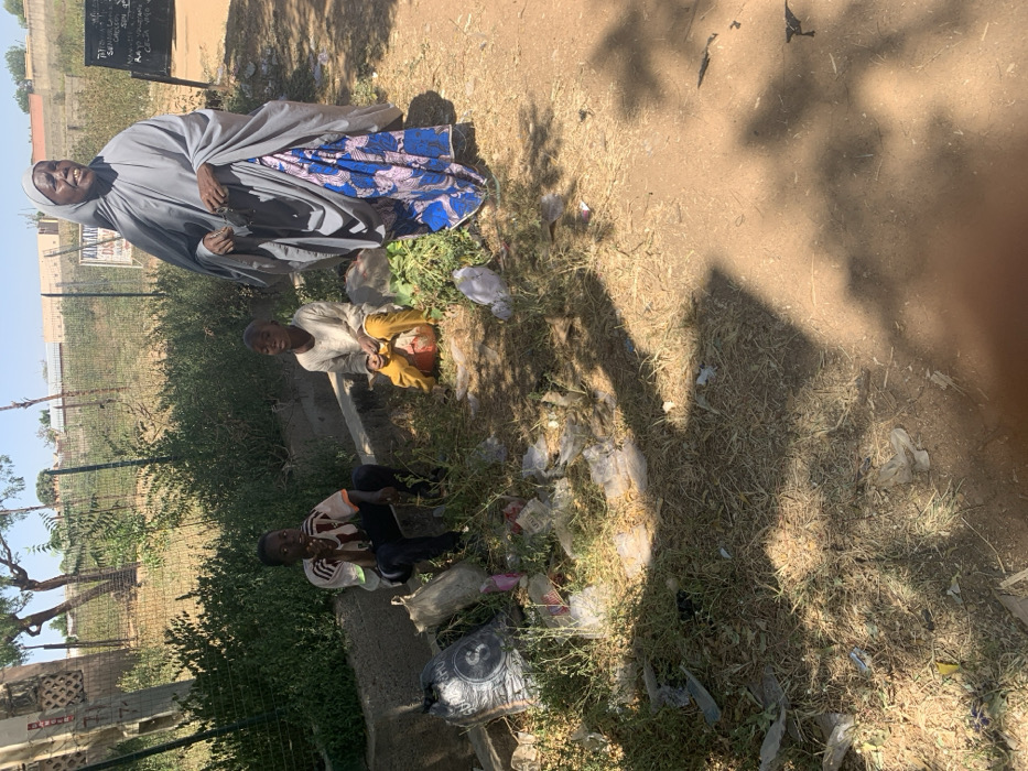 This image, taken in Dabawa, Nigeria, depicts an outdoor scene featuring an elderly woman and two young boys on a sunny day