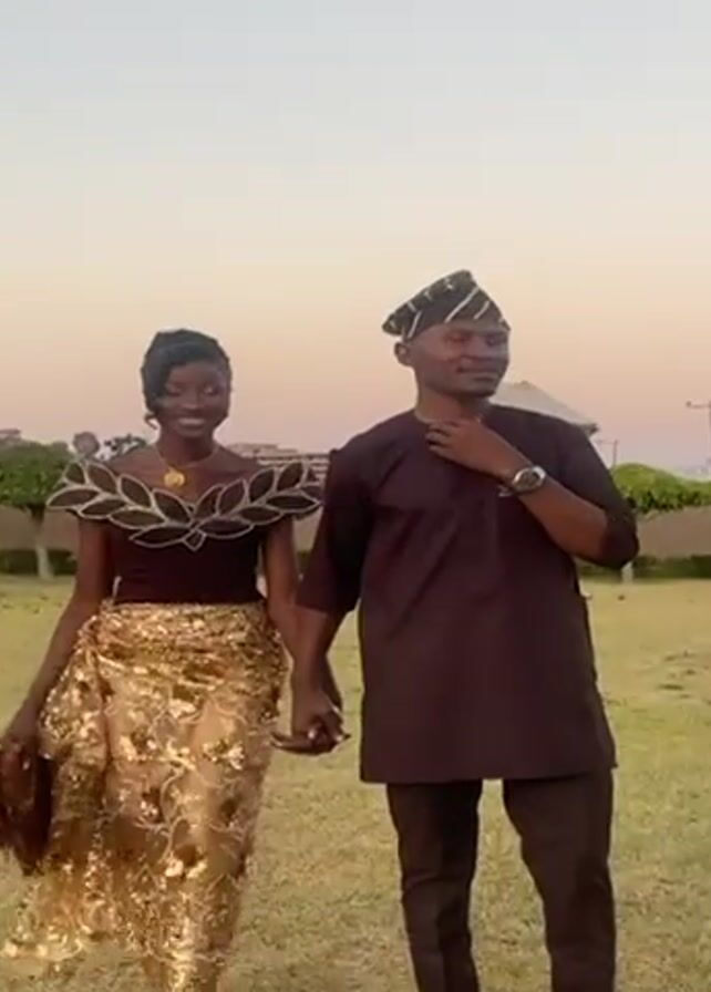 A young woman and man are standing on a grassy field, holding hands, and looking at the camera. The woman is wearing a brown and gold traditional Nigerian outfit. The man is wearing a brown traditional outfit with a matching hat. The background consists of a low wall, trees and a building. The sky is a pale pink and blue indicating twilight. The couple seems happy, and they are likely posing for a photo or video. The lighting is soft and even, typical of early evening.