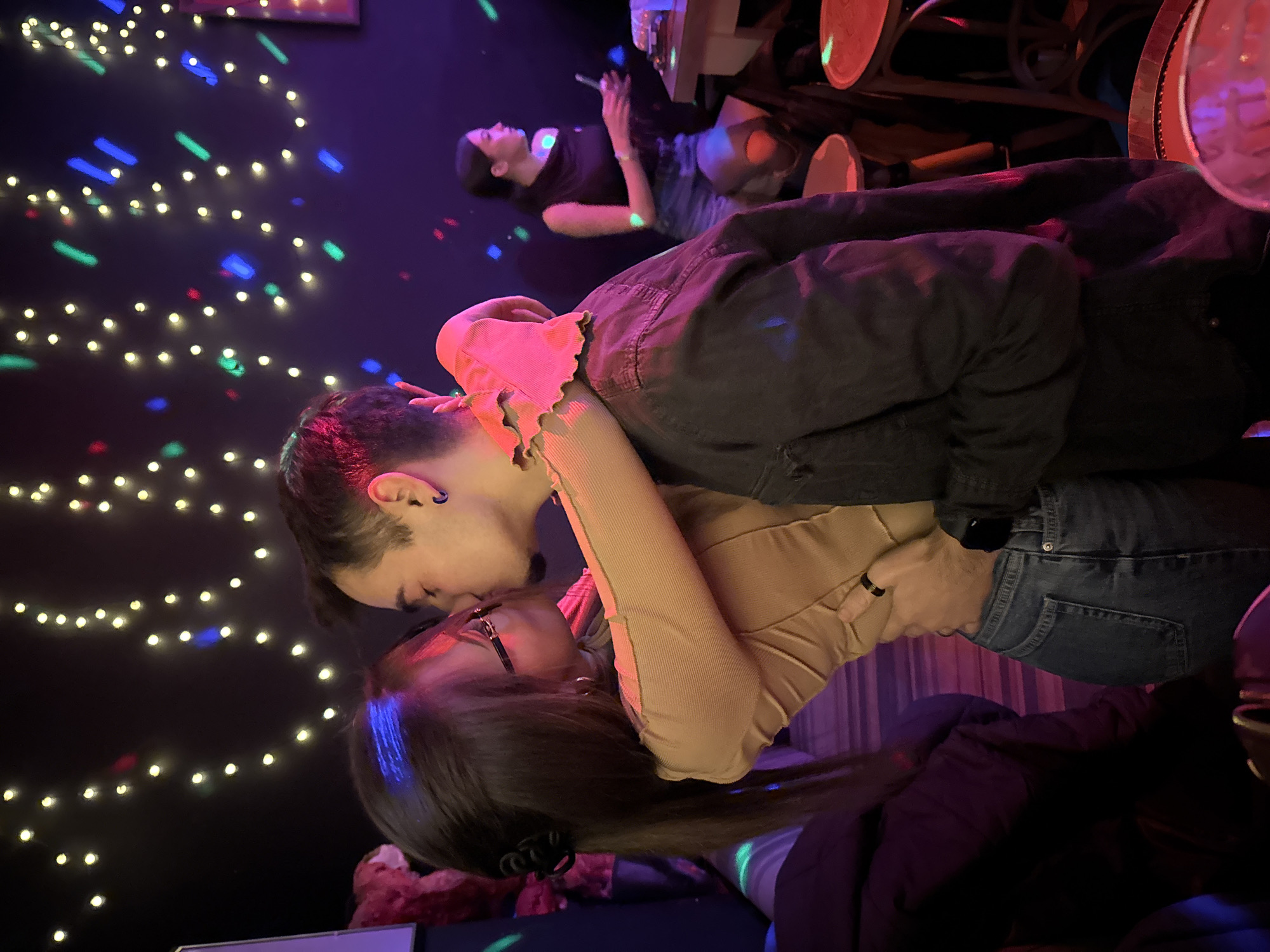 This image depicts three individuals within a dimly lit indoor establishment, presumed to be a bar or club in Sofia, Bulgaria. The background features dark walls and a ceiling adorned with warm yellow string lights and intermittent moving colored light reflections (blue, green, red). In the foreground, a female subject with long brown hair, glasses, a light tan ribbed long-sleeve top, and blue jeans is kissing and embracing a male subject with dark hair, stubble, a dark denim jacket, and a black earring. Her arms are wrapped around his neck/shoulder, and his right hand is on her waist/hip. A dark ring is visible on the female's left hand. To the right in the background, a third female individual with dark hair in a ponytail, wearing a dark sleeveless top and ripped blue jeans/shorts, sits at a light wooden table, interacting with a smartphone and holding a glass. Wooden bar stools are visible throughout the scene, along with a partially obscured reddish-pink plush toy on the far left and a glass with reddish liquid in the immediate foreground. The precise establishment within Sofia is not identifiable from the image content.