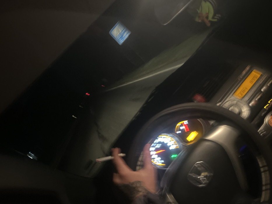 The image depicts the interior of a vehicle at night, specifically in Priseltsi, Bulgaria, viewed from the driver's perspective looking forward. A right hand, featuring visible tattoos on the forearm, holds a lit cigarette in the upper left quadrant of the frame. The vehicle's steering wheel is centered in the lower left, bearing an indistinct emblem. Behind the steering wheel, the illuminated instrument cluster shows a primary gauge (likely a speedometer or tachometer) with its needle indicating a significant reading and a green indicator light active. To its right, a fuel gauge displays a low fuel level, indicated by the needle positioned in the red/yellow zone. Below the instrument cluster, part of the infotainment system or radio is visible with an orange-lit display. Through the windshield, a dark road is visible, illuminated by vehicle lights in the distance appearing as red and white streaks, suggesting other traffic. A faint white road line runs along the right side of the visible road. A blue sticker, possibly a vignette or parking permit, is affixed to the upper right portion of the windshield. A light green, character-shaped object, likely an air freshener or ornament, hangs near the bottom right edge of the windshield. The overall image quality is blurry due to low light and/or motion.