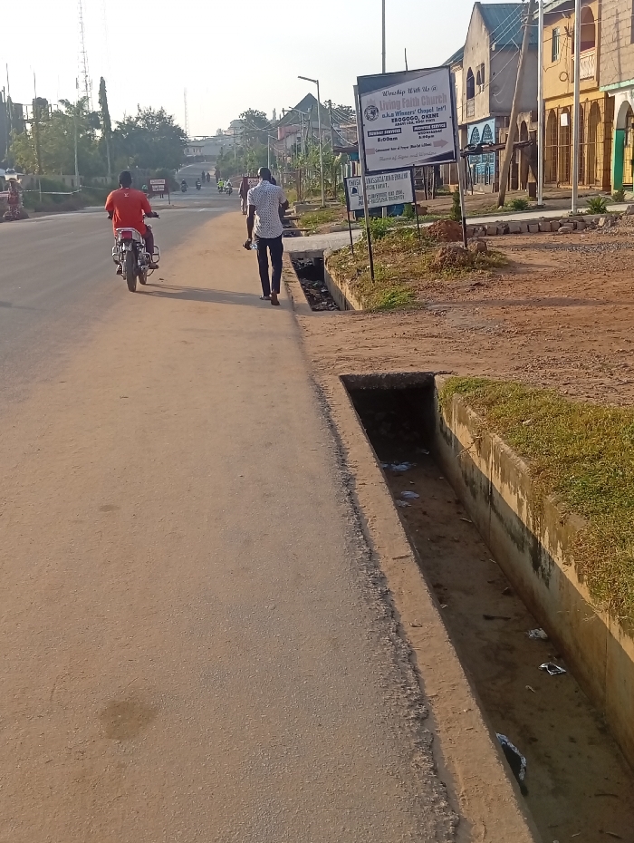 An outdoor shot showcases a street scene featuring a motorcyclist and a pedestrian. The motorcyclist, in a red shirt, rides away from the viewer. The pedestrian, wearing a white patterned shirt and dark pants, walks in the same direction. Along the road, a concrete drainage ditch filled with trash and debris runs parallel. Signage for the "Living Faith Church" stands prominently. Buildings line the opposite side of the road. The road itself is wide and dusty. The sky is overcast, suggesting an early morning or late afternoon.