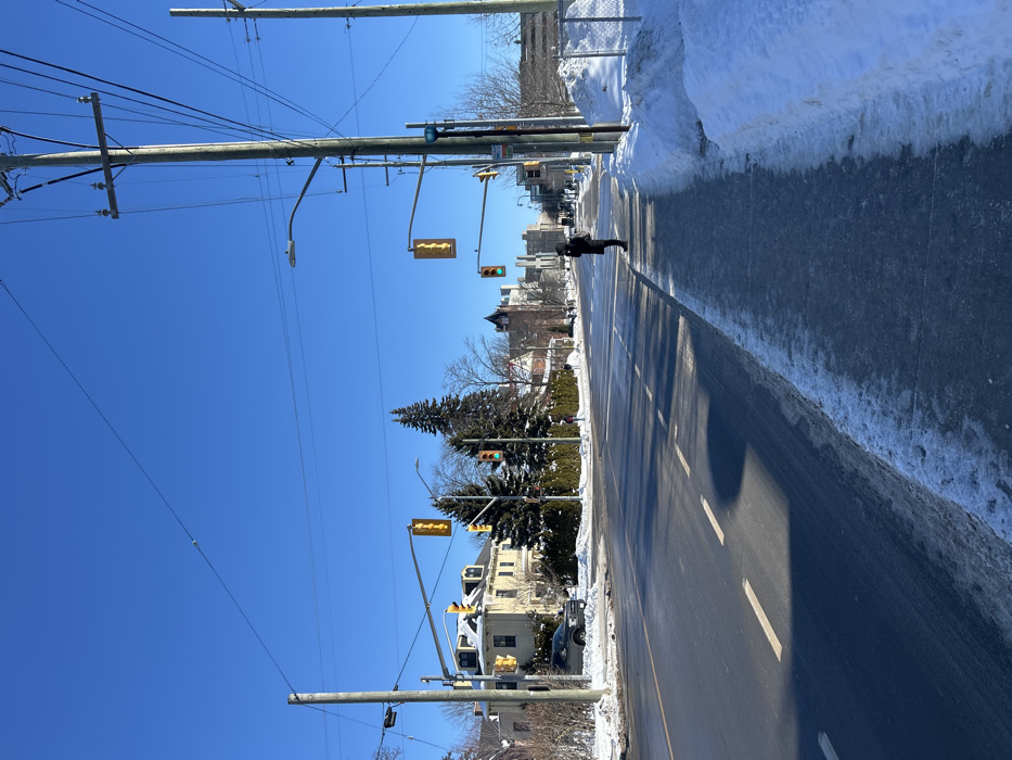 This is an outdoor urban scene on University Avenue in Kingston, Ontario, Canada, looking north towards Queen's University campus, specifically near the intersection with Earl Street. The environment is a sunny winter day, characterized by a clear blue sky and snow covering the ground, sidewalks, and road shoulders. The multi-lane asphalt road appears dark and potentially wet or icy in areas, with visible white dashed lane markings. Utility poles with numerous overhead power lines and communication cables line both sides of the street. Multiple streetlights are present. Traffic lights at the immediate intersection are displaying yellow, while traffic lights further down University Avenue are green. A blue pedestrian signal box is mounted on a utility pole on the right side. On the left, a large, light-colored, multi-story building with a pitched roof and dormer windows is visible behind bare deciduous trees. A dark-colored pickup truck is parked facing away from the camera on the left side of the street, partially obscured by snow. Further north, institutional or university buildings, including a prominent stone structure with a tower-like feature, are discernible in the distance. The right side of the street features a concrete sidewalk, with significant snowbanks to its right, and a chain-link fence partially visible beyond the snow. One individual, dressed in a dark coat and dark pants, stands on the right-hand sidewalk at the edge of the street, facing away from the camera, positioned as if waiting. Two additional, small figures are faintly visible much further down the left sidewalk.