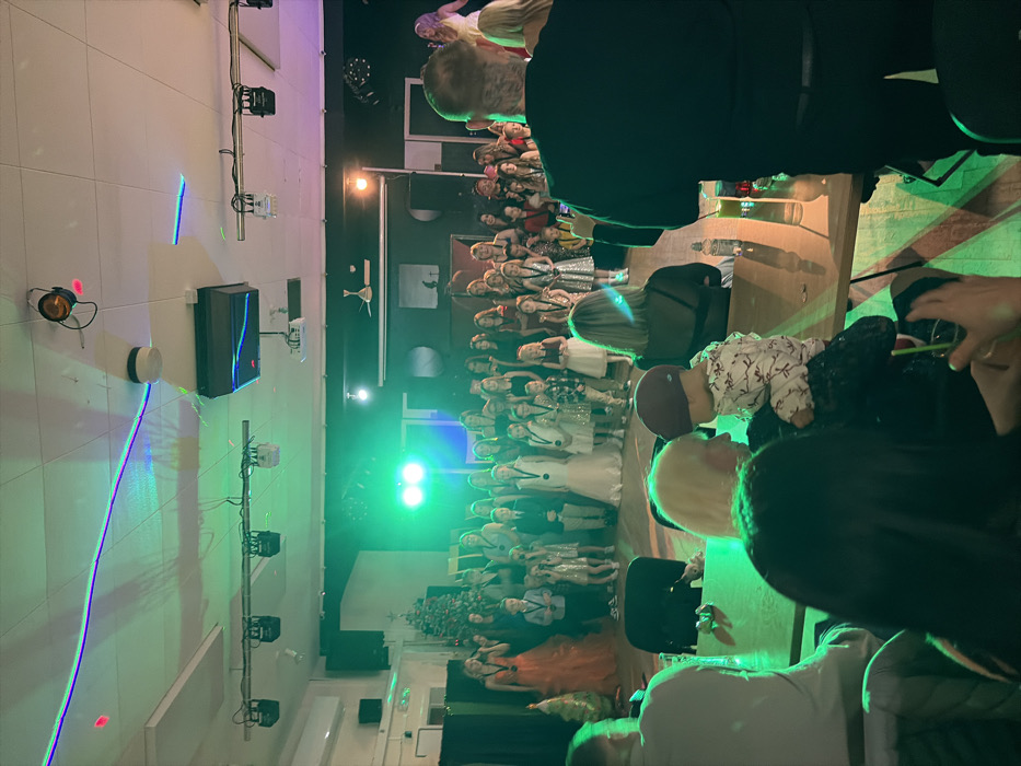A large group of children dressed in various costumes, including dresses, suits, and traditional attire, pose on a stage under bright green spotlights. A Christmas tree is visible to the left. Audience members observe, some with cameras raised. The venue has a white wall with stage lighting equipment attached and a neon blue laser line. People in the foreground are out of focus, obscuring the scene.